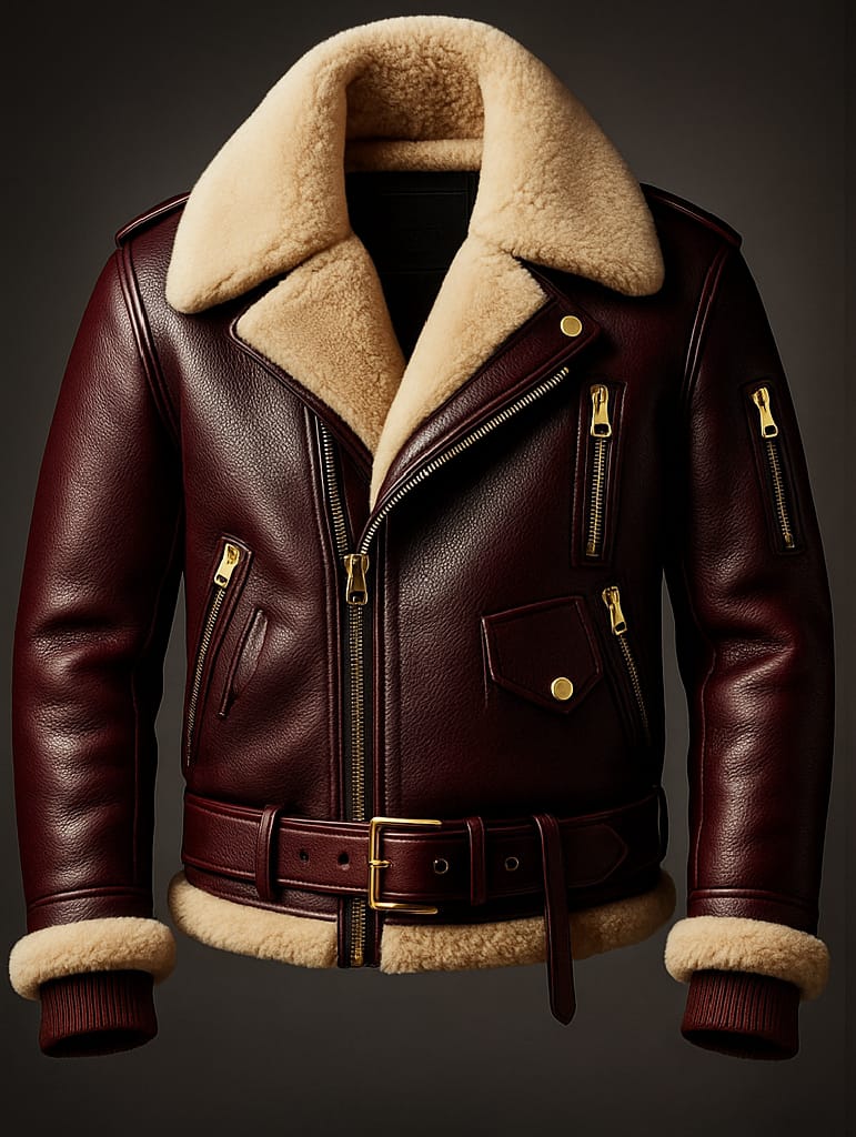 The Sultan Crimson Rex is a bold declaration of power and elegance. The deep red shearling radiates authority, while the contrasting white fur collar adds a sharp note of refinement. Finished with brass-toned hardware, this piece balances raw strength with aristocratic charm—a jacket that feels as fearless as it looks.
