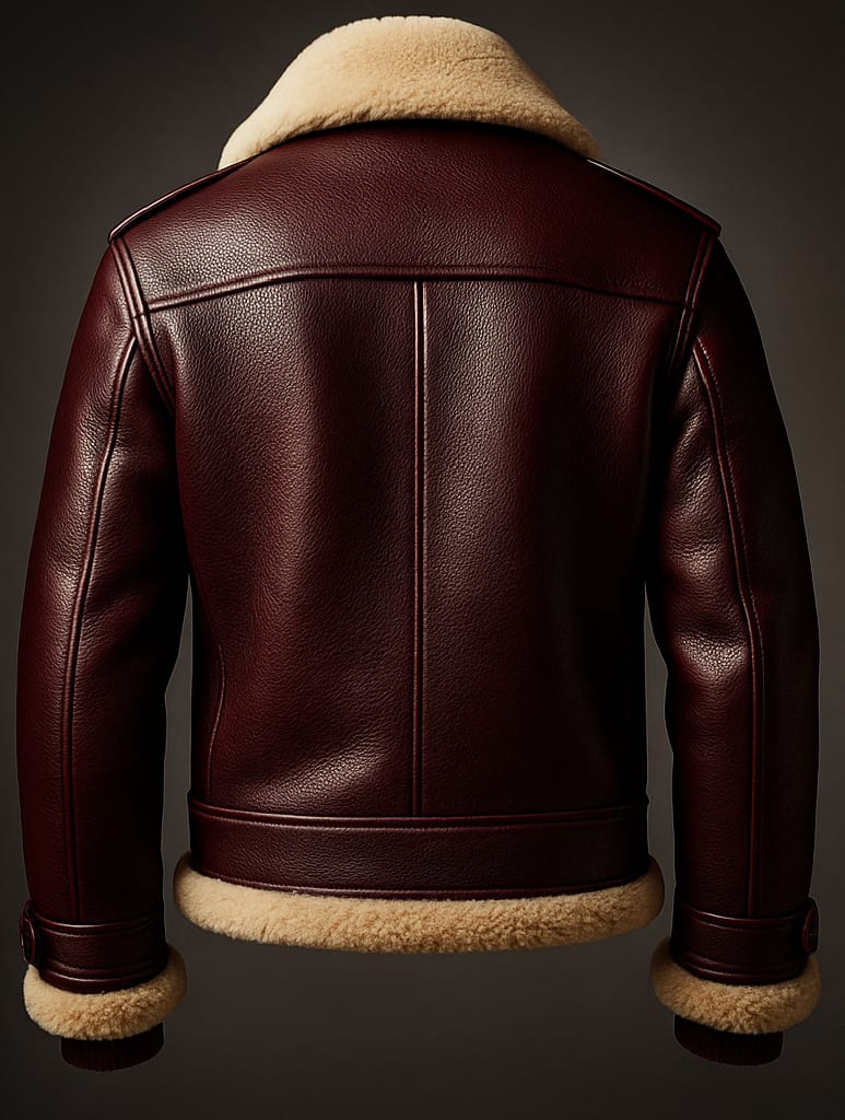Premium red shearling leather with a soft white fur collar. Hardware: Brass-colored zippers and fastenings, adding a regal, vintage warmth.