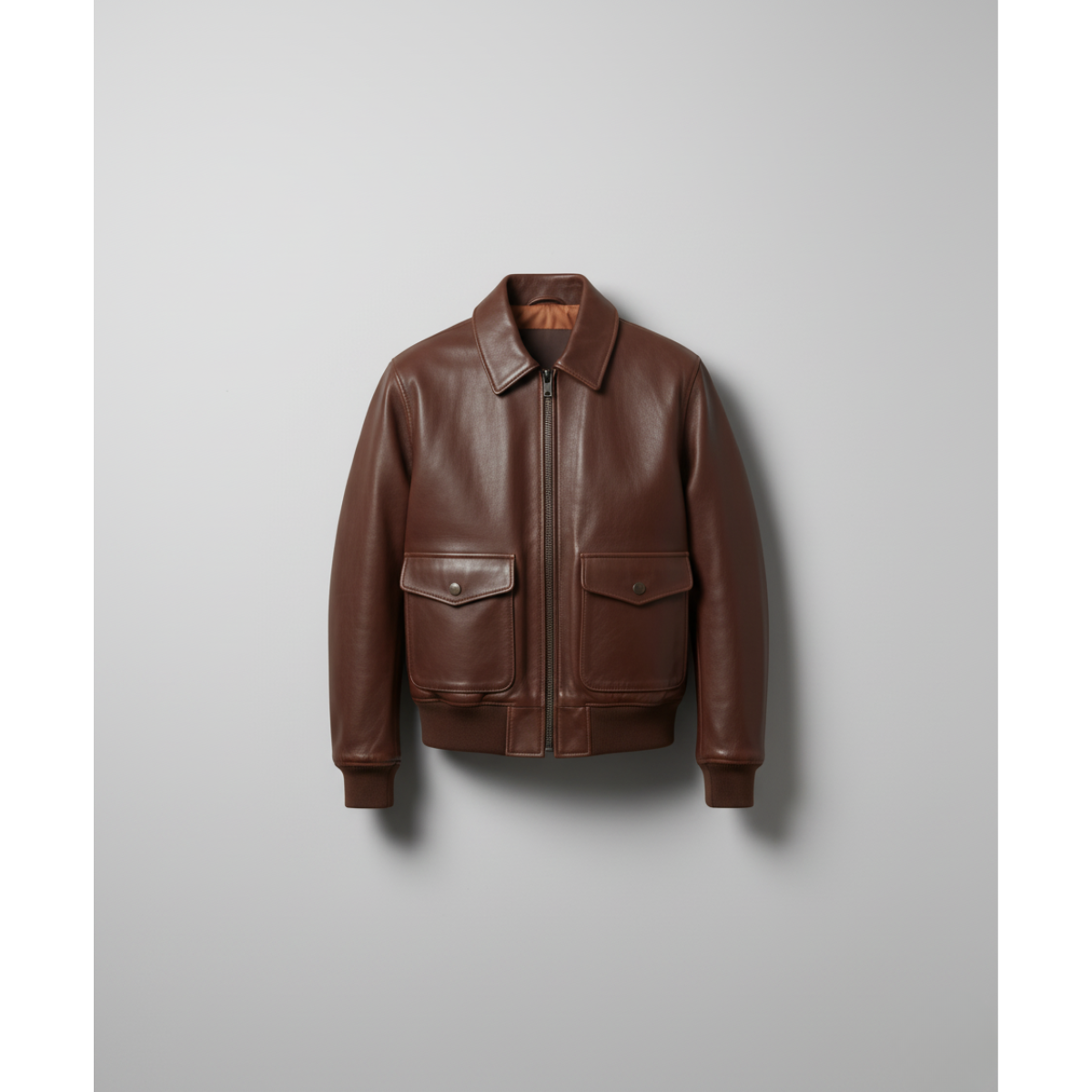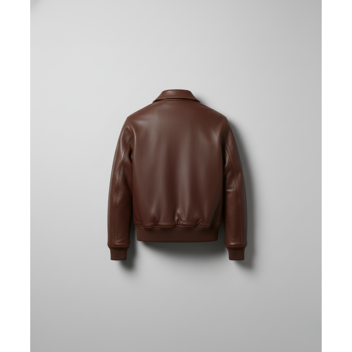 Front view of The Sultan's Aviator Bomber Leather Jacket, a classic brown Bomber Leather Jacket with a zippered front, ribbed cuffs and waist, and a clean leather collar. The jacket showcases the smooth, high-quality leather finish.The Sultan’s Aviator Bomber Leather Jacket